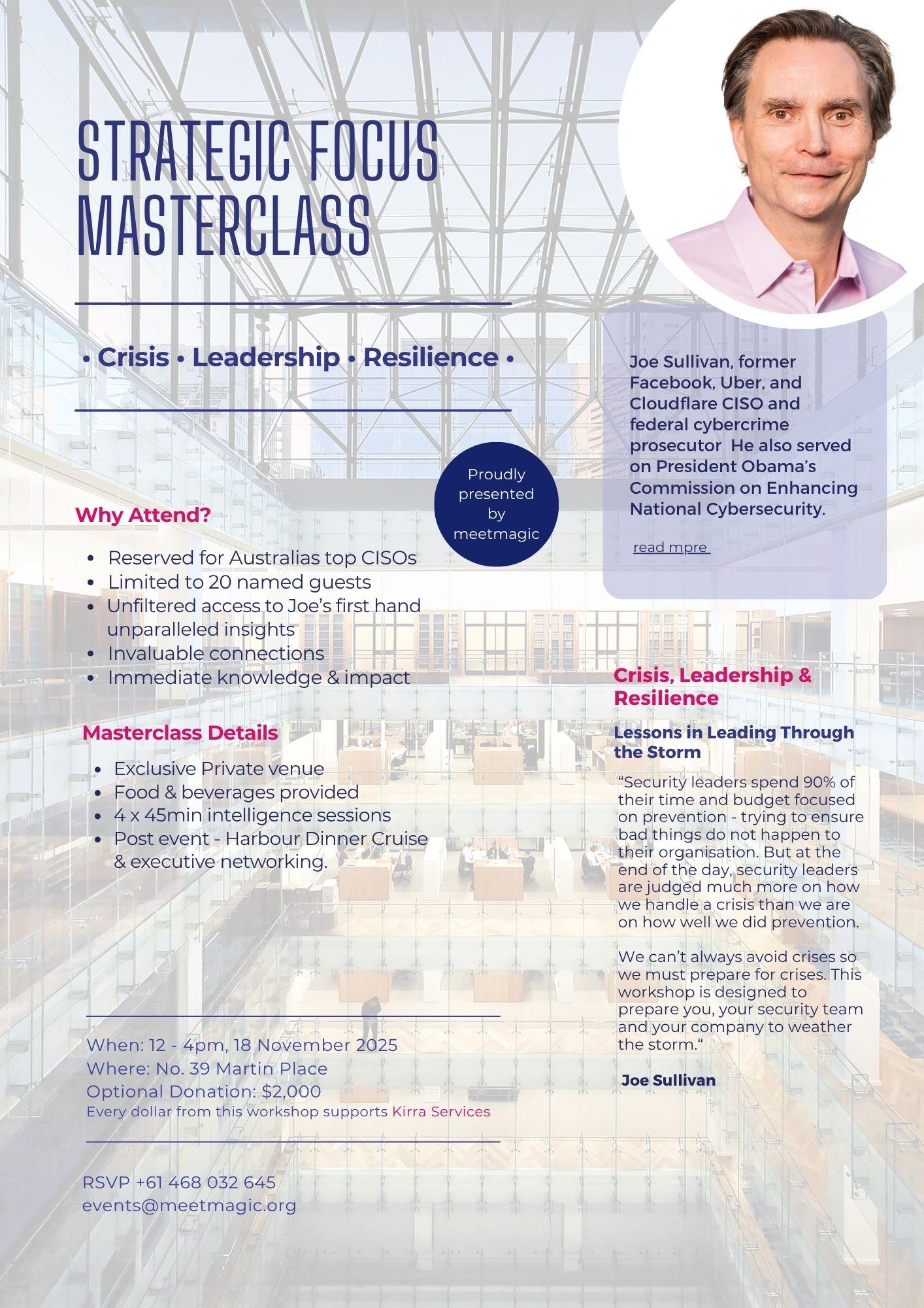An exclusive 4 Hour Masterclass for Australia's Top CISOs followed by a Harbour cruise you won't want to miss